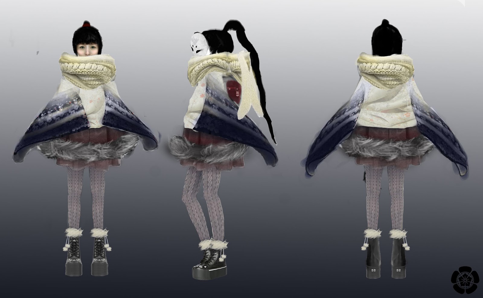 After modelling some low poly assets in 3ds max for my characters clothes,such as the top, cloak, scarf, skirt, shoes and fur, I imported them all to Zbrush as sub objects to my girl Ztool and began adding details. I also worked more on the girls face, using two spheres on a sub tool inside the face as the eyes, so it would be easier to sculpt the eyelids over the top.